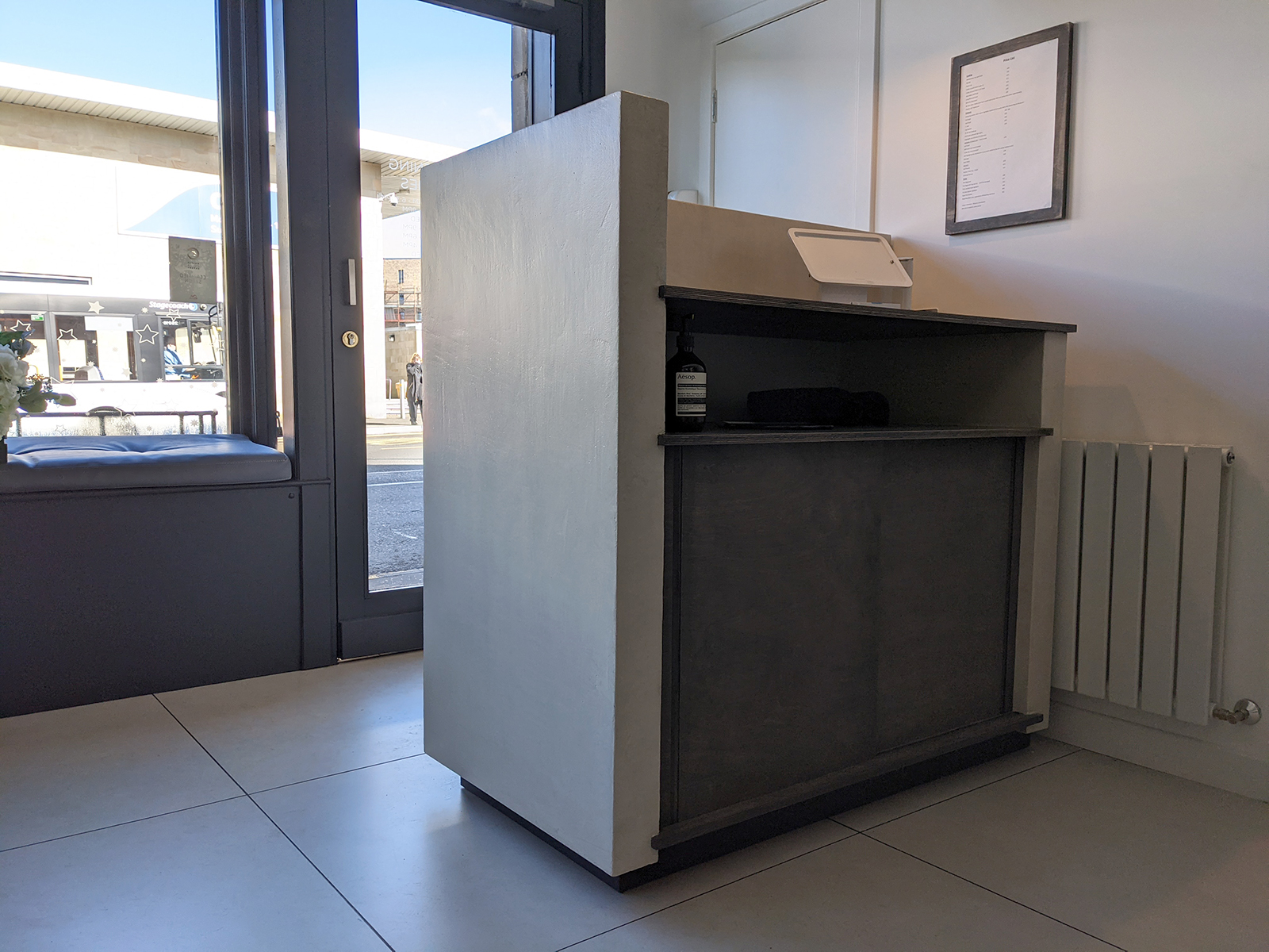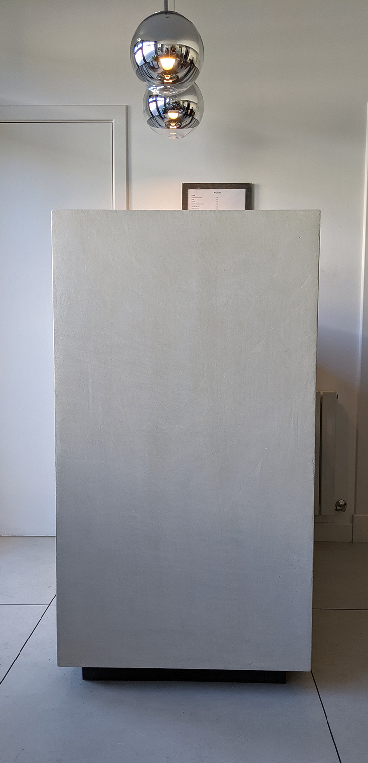 Desk for Hair 13 Post date 12 April 2021 Reception desk for Hair, Dunfermline Grey stained plywood and micro-concrete by Carlos.